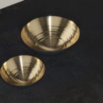 En grafittonad bas med en rökig patina som omgärdas av en dimma, adderat med gröna och gula nyanser som ger den förkolnade metallbakgrunden en känsla av industrimetaller. Matt finish.