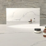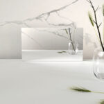 En stilren, vit basyta fylld av djärva ljusgrå ådringar i varierande storlekar – allt från dramatiska stråk i djärvare toner till blygsamma antydningar av gråtoner som lätt ristats i bakgrunden – vilket skapar ett iögonfallande och intensivt djup.