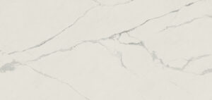 En stilren, vit basyta fylld av djärva ljusgrå ådringar i varierande storlekar – allt från dramatiska stråk i djärvare toner till blygsamma antydningar av gråtoner som lätt ristats i bakgrunden – vilket skapar ett iögonfallande och intensivt djup.