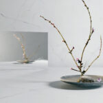 En pärlvit bakgrund, genomkorsad av sprakande mörkgrå ådror som sveper över den upplysta snäckliknande ytan i sina bleka undertoner. Detta ger upphov till en ny, dynamisk dimension som ytterligare förstärks av den slipade ytbehandlingen och en unik design som är verkligt innovativ.
