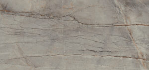 En rökgrå fossilliknande basyta, lika väderbiten som en sten. Ett geologiskt landskap som vaknar till liv som yta och vars starka jordnära närvaro återspeglas i en komplex struktur av smala mörka ådror i samspel med mer framträdande stråk – allt framhävs av patinafläckar, rostig silt, kritvita strimmor och orange brända markeringar, i en Ultra Rough-ytbehandling.