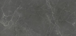 Mörkgrått blandas med varma bruna markeringar i ett intrikat mönster som förstärks av små fläckar och oxideringseffekter vilka fångar naturstenens estetiska imperfektion, medan vita organiska ådror och smalare kalklinjer ger riktning och dramatisk effekt i en slipad ytbehandling.