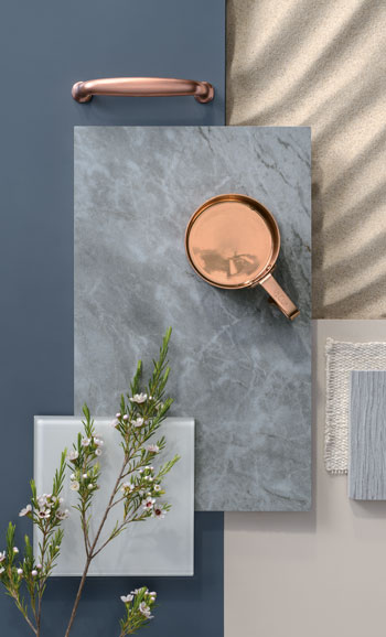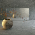 En frodig, mjukt mönstrad och pärlgrå bas, uppbyggd av ett flertal lager med milda blåaktiga undertoner, som försiktigt vidrörs av det dynamiska djupet i dess fjäderlätta sjögrå ådring och subtila mörkgrå skuggor, färgade med jordiga spår och salviaaccenter – allt i en slipad ytbehandling