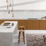 I ett ljust, minimalistiskt utrymme används raka linjer och en rad olika naturmaterial för att komplettera texturerade skivor med en harmonisk, naturinspirerad look.