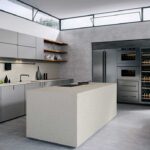 En klassisk, neutralt färgad kanvas, prydd med spontana glimtar av svart basalt och genomlysande gråtoner, vilka sammanför terrazzo-stenens lekfullhet med betongens robusthet.
