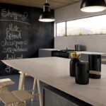 Ett ungdomligt industrikök med en överraskande twist som orsakas av den svarta tavlan, enkelt stiliserat med pallar, bord och belysning som ger rummet en känsla av frihet och balans.