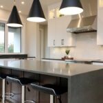 I det här moderna minimalistiska utrymmet ligger fokus på att kontrastera den grova, mörka stenytan mot de släta, vita skåpen och den stilfulla belysningen som blir pricken över iet.