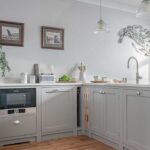 Den här stiltypiska övergångslooken kombinerar en ljus stenbänkskiva med "ton-i-ton"-skåp i en monokromatisk palett.